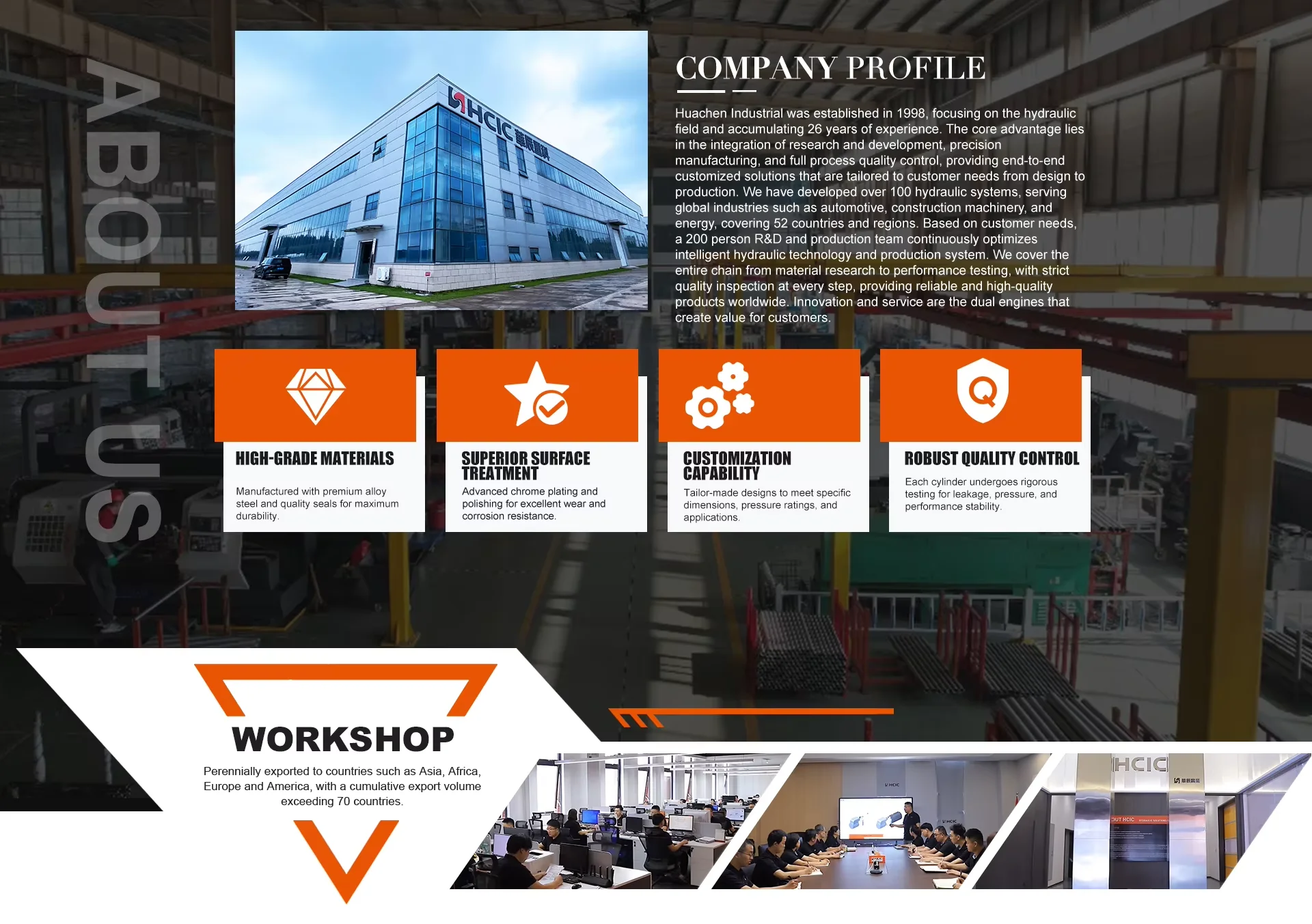 HCIC Hydraulic è un produttore idraulico professionale, specializzato nella progettazione, produzione, installazione, trasformazione, messa in servizio e vendita di marchi di componenti idraulici di sistemi idraulici. Offriamo servizi tecnici e ci impegniamo a fornire ai nostri clienti prodotti sicuri e affidabili che soddisfano i requisiti più esigenti. Il team di ingegneri HCIC lavora a stretto contatto con i clienti per comprendere le loro applicazioni. Utilizzando una serie di metodi di progettazione comprovati e apparecchiature di produzione avanzate, abbinati a un'esperienza ingegneristica e produttiva senza rivali, HCIC Hydraulics sviluppa cilindri idraulici sicuri e affidabili per applicazioni critiche, supportati da un servizio clienti senza pari. Progettiamo, progettiamo e produciamo cilindri idraulici in uno stabilimento di produzione all'avanguardia e aderiamo al nostro sistema di gestione della qualità certificato ISO 9001-2015 per garantire ai nostri clienti prodotti della massima qualità.